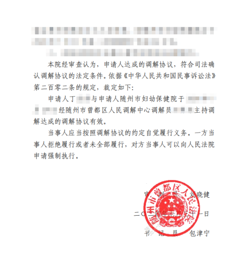 随后曾都区人民法院诉前调解团队趁热打铁,迅速启动“诉前调解+司法确认”机制,将双方的调解协议制作成民事调解书,为当事人兑现权益提供司法保障。