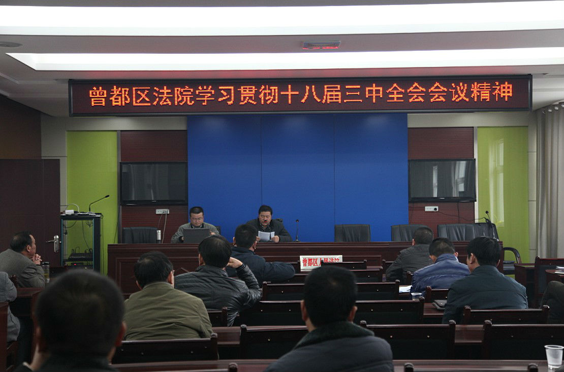 12月12日下午,曾都区法院组织全院干警认真学习贯彻十八届三中全会会议公报,贯彻落实十八届三中全会精神,会上还宣读了《党政机关厉行节约反对浪费条例》和通报了省高院警务督察报告。