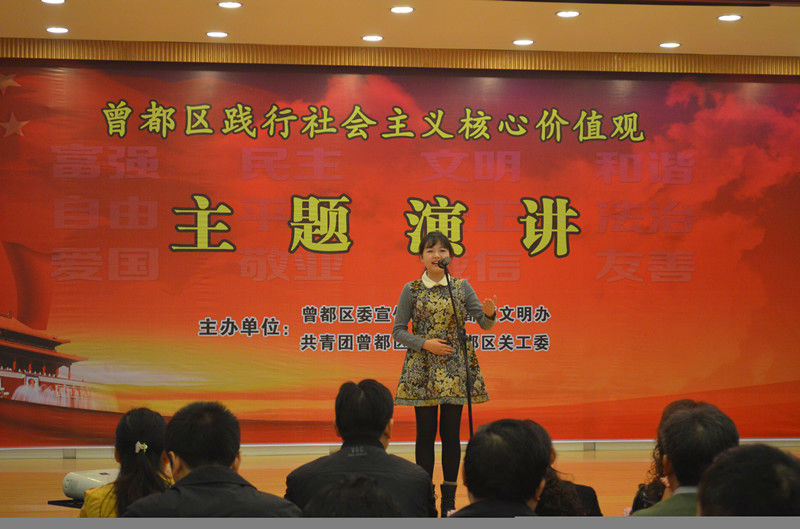 为深入学习贯彻党的十八大精神,引导干部职工进一步坚定政治方向、强化宗旨意识、端正价值取向,10月31日上午,曾都区践行社会主义核心价值观主题演讲决赛在曾都宾馆3楼会议室进行,包括我院朱妍同志在内共18名选手参加此次比赛。